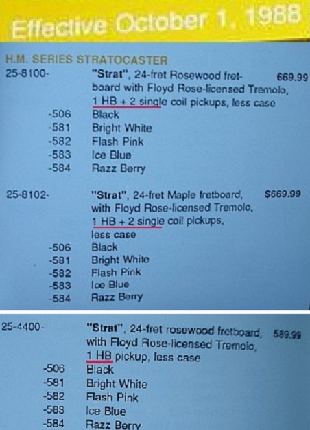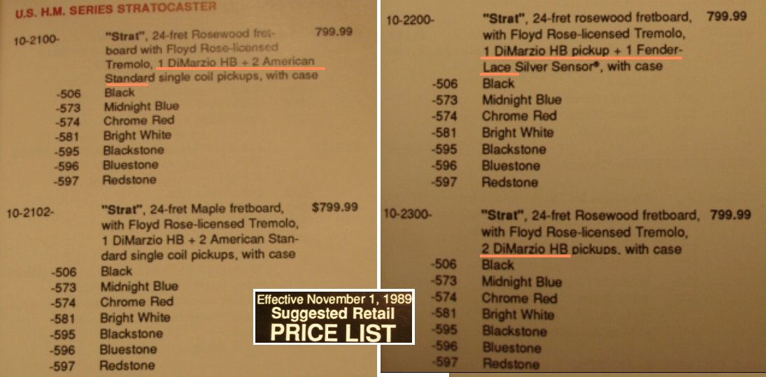 I noted the '88 price list describes the line as merely "H.M. Series Stratocaster", while the '89 price list mentions, "U.S. H.M. Series Stratocaster" from which one might garner the earliest models were the Japan/US collaboration, followed by a straight USA-made.